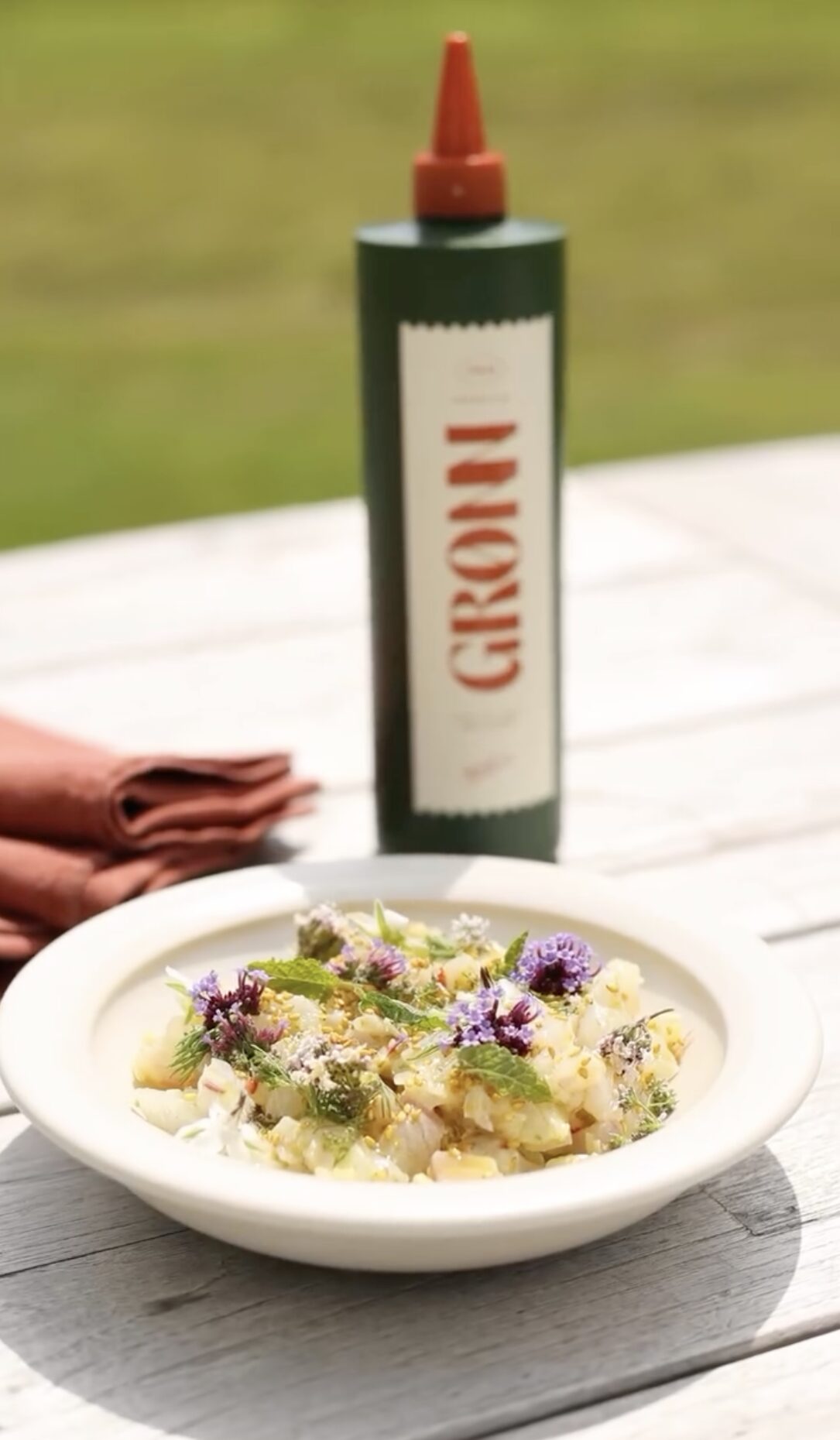 En frisk og præcis ceviche med fokus på rå fisk og balanceret syre. Ingefær og chili tilfører varme, mens citrus og Thai Grønn Olie giver friskhed og aromatisk kompleksitet. Afsluttet med yuzu-sesam og friske blomster for tekstur og visuel kontrast.
