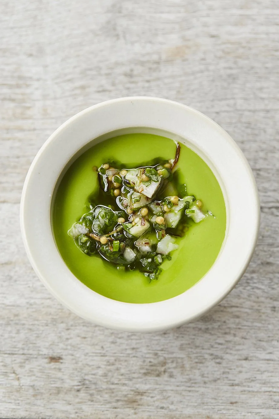 En emulgeret mayonnaise med tydelig grøn karakter fra porreolie. Sennep og syre balancerer fedmen, mens konsistensen holdes stabil ved langsom tilsætning af olie. Kan serveres ren eller udvides med røget ål og friske urter.