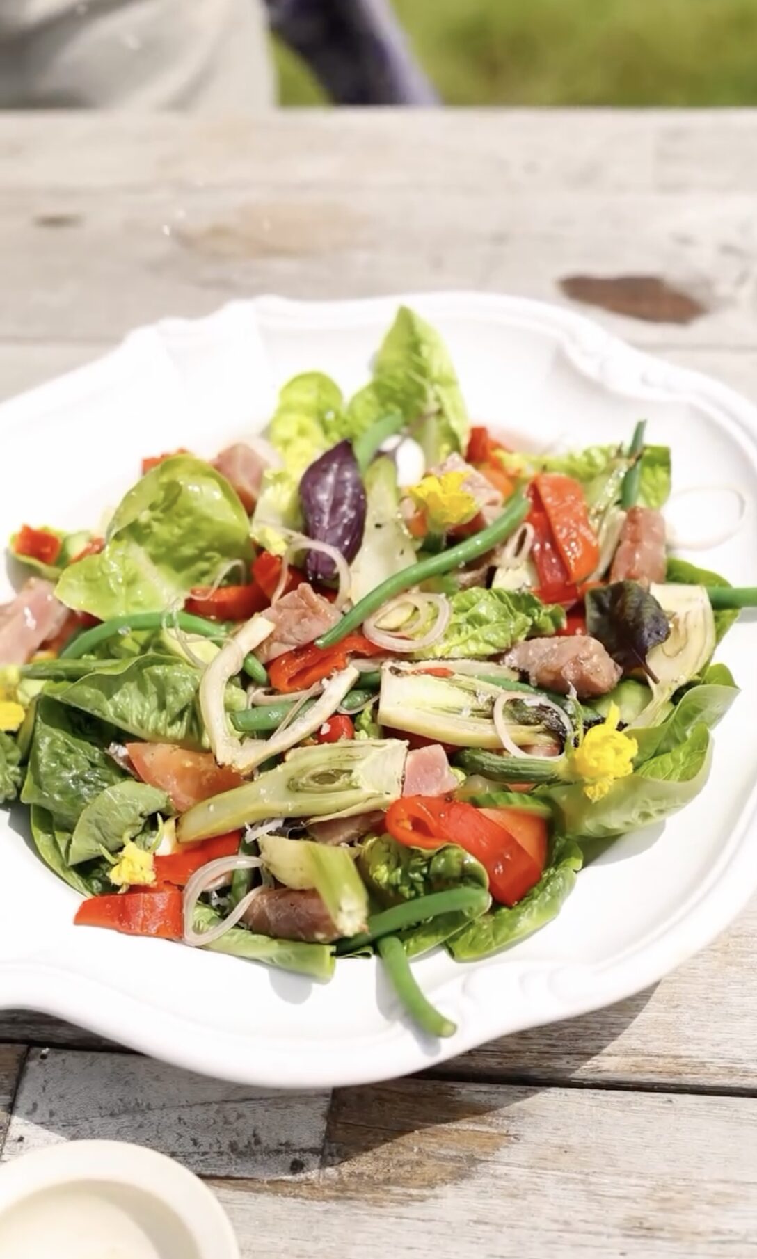 2. Anret salaten Fordel grillede Grøntsager, Salat, Vagtelæg, Ansjosfileter og Sorte oliven på et stort fad. Læg den grillede Tun øverst.