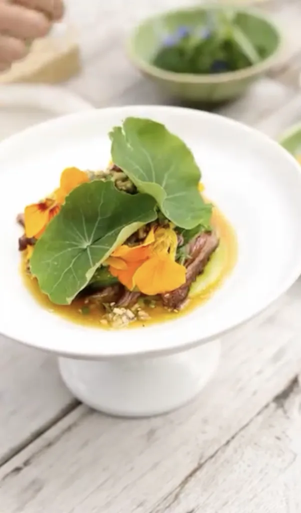 En klassisk grøntsagsterrine med middelhavspræg. Sauterede grøntsager og oliventapenade bygges i lag og sættes på køl for fast struktur. Serveres med en emulgeret basilikumolie-dressing og en koncentreret tomatreduktion med citrus og krydderurter. Egnet som forret eller vegetarisk hovedret.