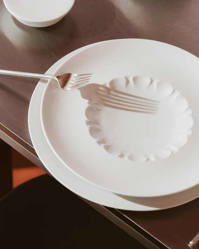 Velvet – Biskuit, uglaseret porcelæn med mat, fløjlsblød overflade. Hvert element håndpoleres med diamantsvamp for ekstra holdbarhed og skulpturel finish.