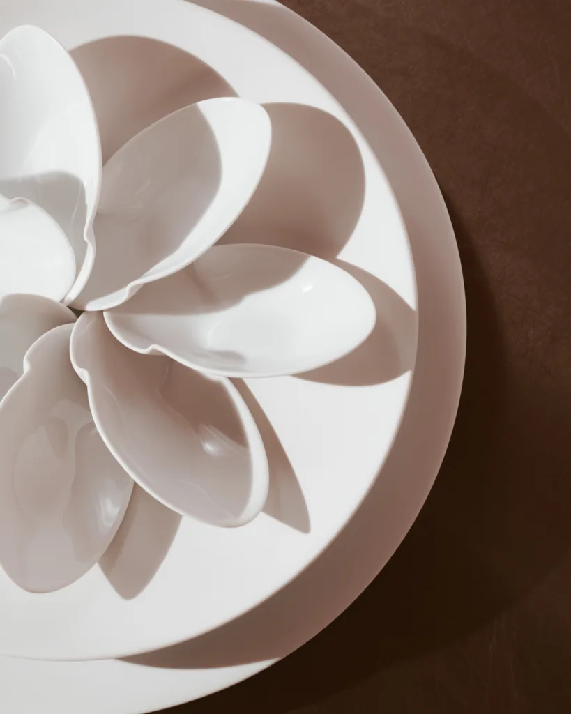 Pulse – En moderne fortolkning af klassisk porcelænsgrafik, hvor shellak appliceres i hånden, hvorefter mønstret vaskes ud og efterfølgende poleres efter brænding ved op til 1400°C.