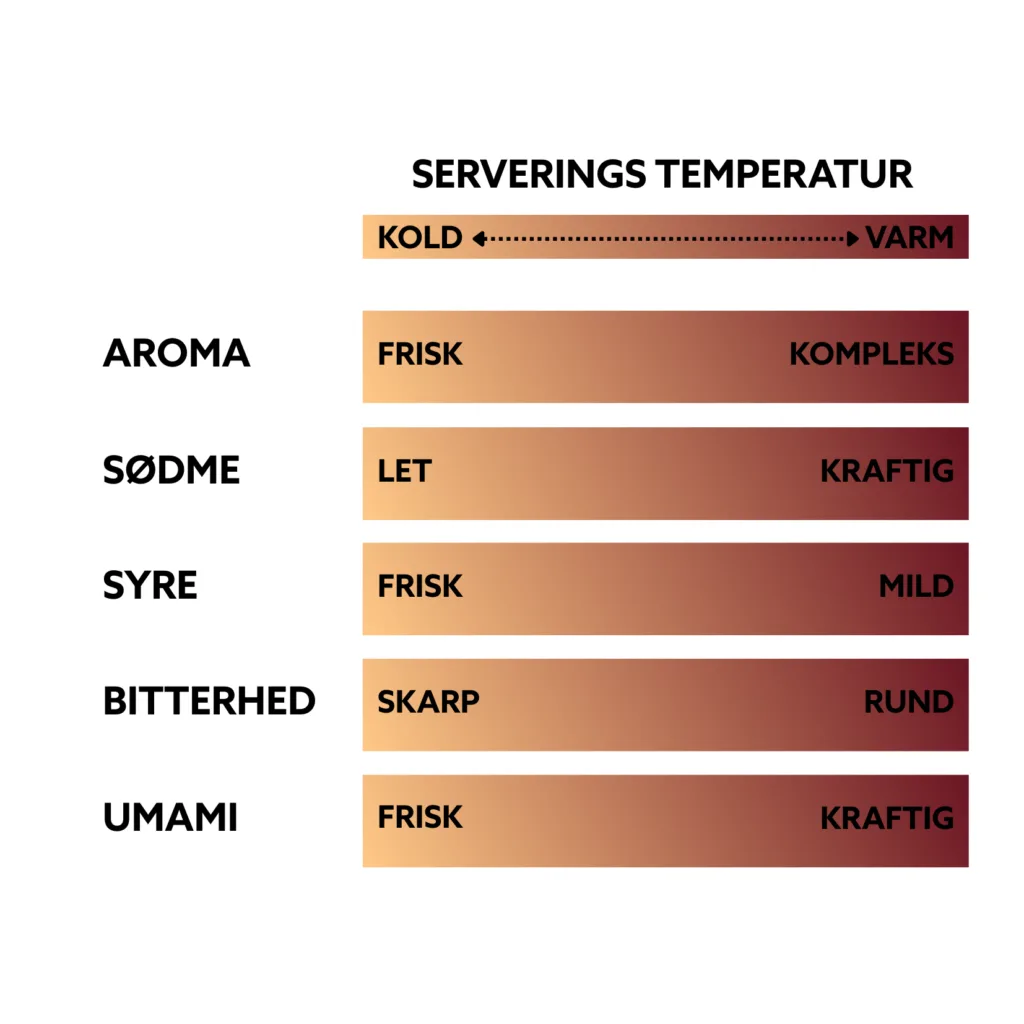 Sake kan nydes ved forskellige temperaturer – varm, stuetempereret eller afkølet. Temperatur har stor indflydelse på både smag og aroma, og ikke alle typer sake egner sig til alle temperaturintervaller. Derfor angiver vi i produktbeskrivelserne symboler, der viser den optimale serveringstemperatur for hver variant.