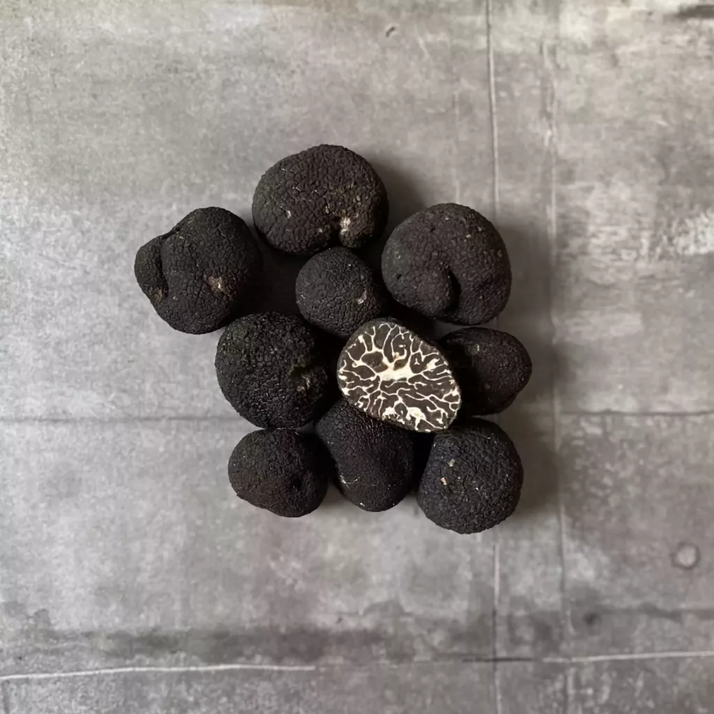 Den sorte vintertrøffel – er kendt for en fyldig og dyb smag og duft med noter af chokolade, cognac, svesker og moskus.Dens indvendige farve går fra brunlig til sort med flotte hvide marmoreringer.Sæsonen løber fra november til marts i europa og fra juni til august i Australien.SERVERINGTrøfler bør serveres tempereret…