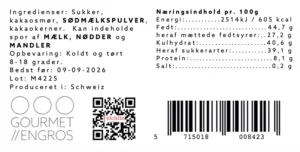 - Oprindelse: Kakaobønner fra Bolivia, hømælk fra Schweiz
