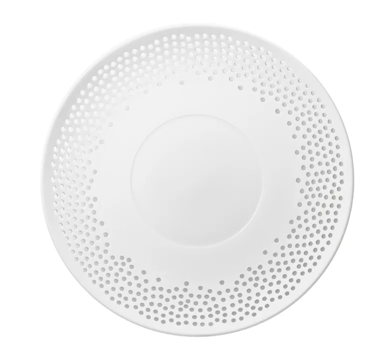 Stor coupe tallerken fra Hering Berlins Cielo-kollektion. Fremstillet med en håndpoleret rand i Biskuit, uglaseret porcelæn, der er perforeret i hånden for et unikt udtryk. Den glaserede overflade sikrer funktionalitet og en smuk kontrast.