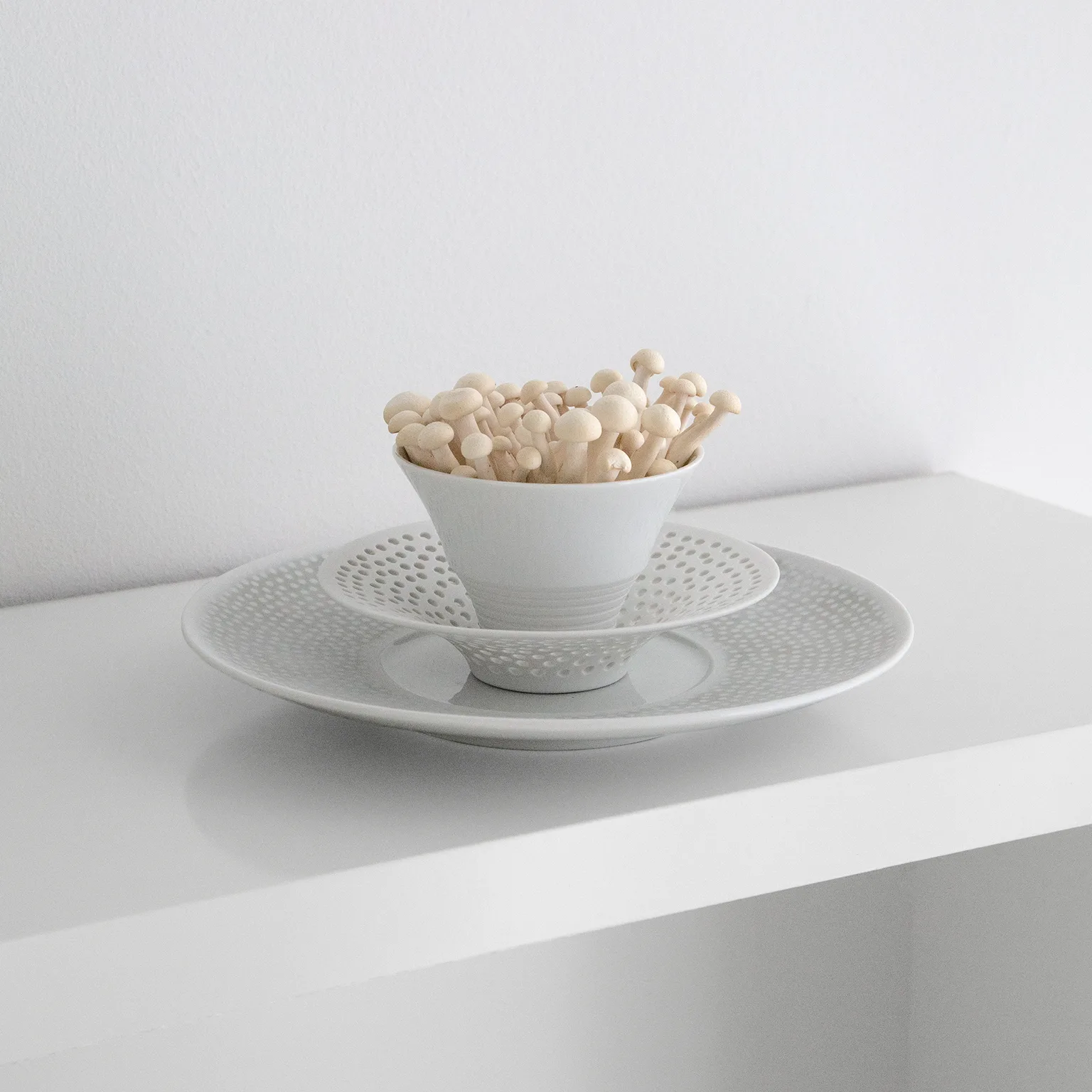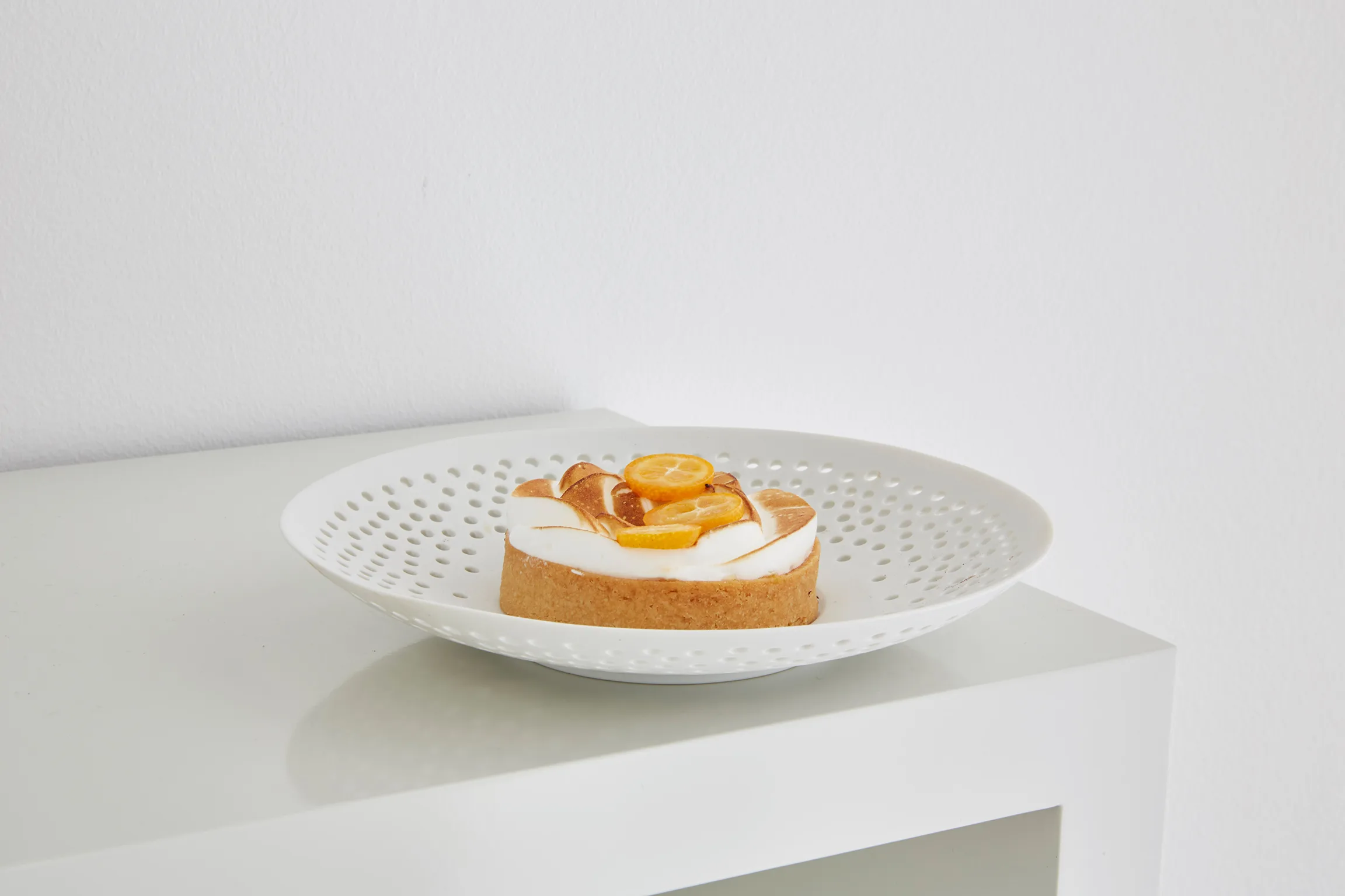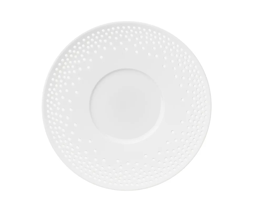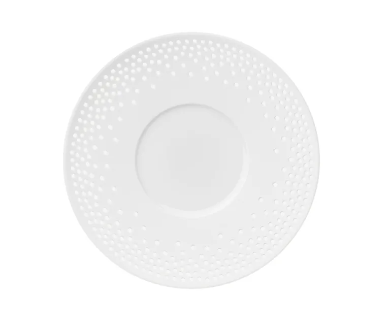 Mellemstor coupe tallerken fra Hering Berlins Cielo-kollektion. Randen er udført i Biskuit, uglaseret porcelæn, håndpoleret og perforeret for et unikt og dekorativt udtryk. Den glaserede overflade skaber en funktionel kontrast, der gør tallerkenen velegnet til mange typer serveringer.