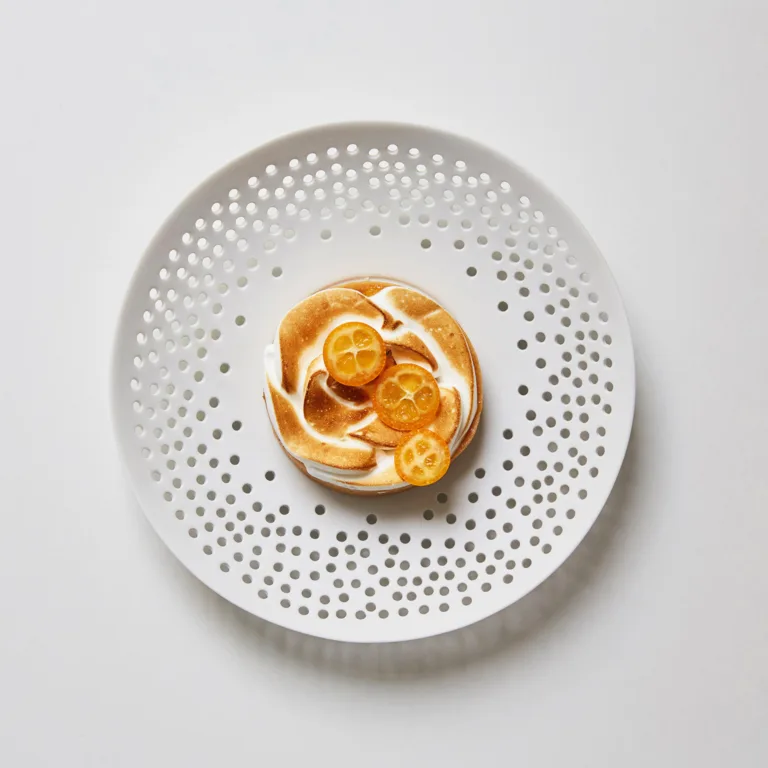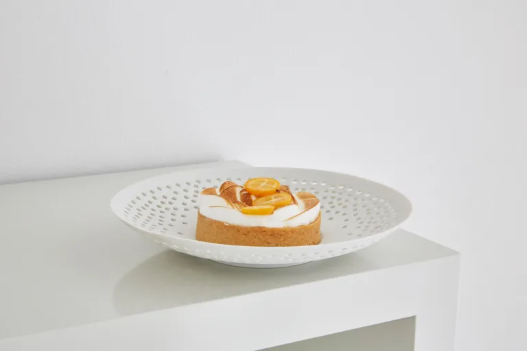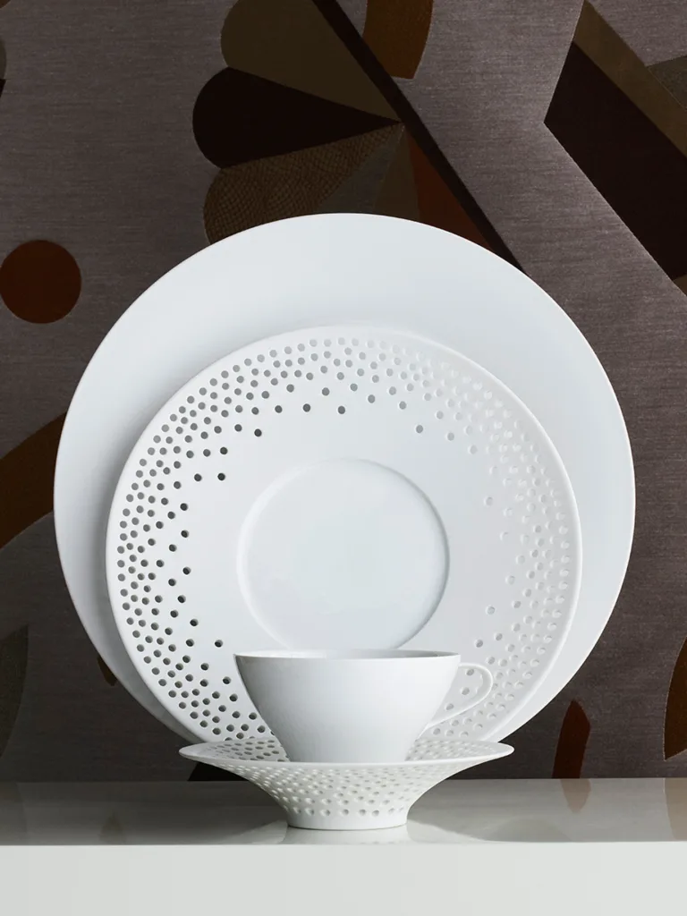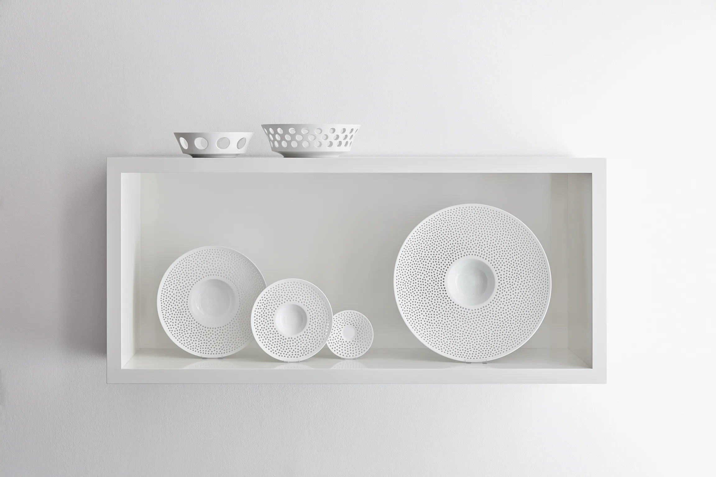 Mellemstor coupe tallerken fra Hering Berlins Cielo-kollektion. Randen er udført i Biskuit, uglaseret porcelæn, håndpoleret og perforeret for et unikt og dekorativt udtryk. Den glaserede overflade skaber en funktionel kontrast, der gør tallerkenen velegnet til mange typer serveringer.