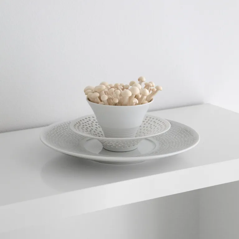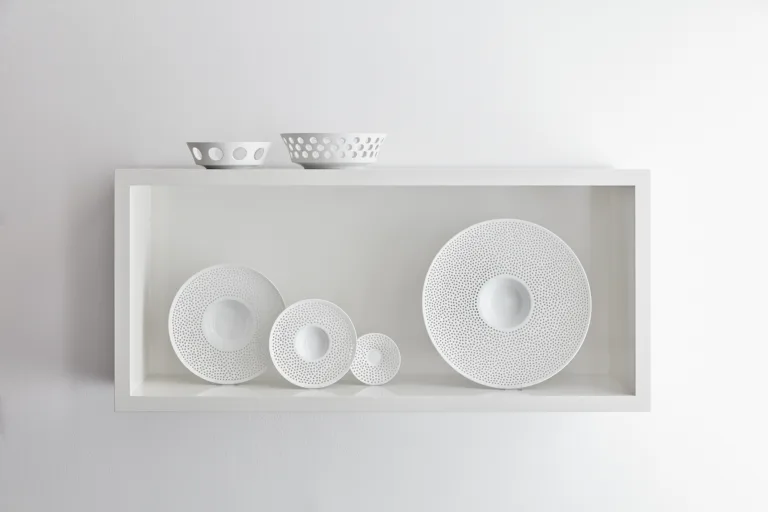 Cielo er en af deres mest krævende dekorationer. Hvert hul bores enkeltvis i det læderhårde, ubrændte porcelæn, hvorefter kanterne tilpasses med en skarp klinge i rustfrit stål og glattes med en fin svamp. Efter højbrænding ved op til 1400 °C poleres overfladen manuelt med et diamantbelagt værktøj.