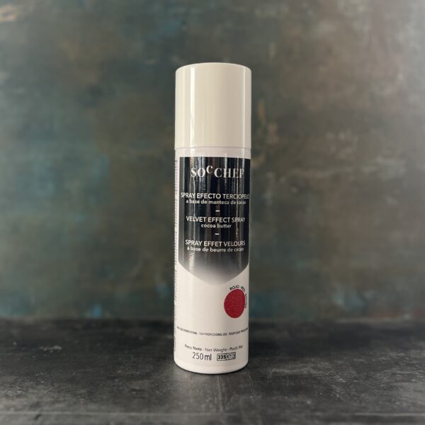 Anvendes til mousse, frosne kager og mange andre produkter. Kun til professionel brug. Ingredienser: Kakaosmør, Farvestof: E101, E129. Drivmiddel (butan propan) 943a, E943b, E944. Kan indeholde spor af: MÆLK, SULFITTER OG SOJA. Velvet effekt fås udelukkende på frosne produkter. Ryst godt før brug, sørg for at produktet er flydende (cylinderen skal have en temperatur på ikke under 25°C og ikke højere end 35°C). Varm dåsen op ved en temperatur på maksimalt 35°C i varmt vand for at smelte kakaosmørret og spray på produkterne. Opbevar produktet ved stuetemperatur (20-25°C) i mindst to timer før brug. Sprøjt et ensartet lag produkt på den kolde overflade, der skal behandles, fra en afstand på ca. 20-25 cm. Vend spraydåsen på hovedet efter brug og spray i et par sekunder for at tømme dysen. Rengør dysen med varmt vand i et par sekunder efter brug af produktet, eller hvis det ikke sprøjter jævnt.