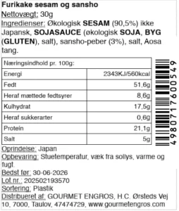 Furikake er en japansk blanding af tang og sesamfrø, der er ristet og krydret. Det blev skabt under Anden Verdenskrig for at gøre de japanske sømænd måltider mere velsmagende. Der findes mange forskellige varianter af furikake i Japan med forskellige smage. Denne furikake er lavet med soyasauce ristet sesamfrø, havsalat og sansho-peber for at bringe en meget behagelig syrlig friskhed, der er så typisk for sansho.
