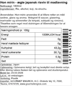Fremstilling: “Hon” er lig med den ægte og autentiske version. Mirin fremstilles ved at fermentere ris og derefter tilsætte en vis mængde alkohol for at stabilisere produktet.
