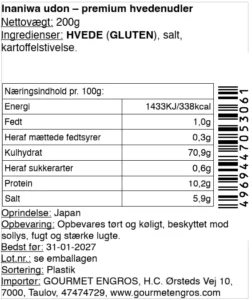Anvendelse: Bring vand i kog og lad nudlerne koge i 3 minutter. Derefter drænes de. Udon spises normalt i japanske klassiske måltider med bouillon lavet af sojasovs, dashi eller miso. De kan bydes både kolde og varme.