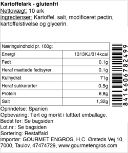 Fremstilling: dehydreret kartoffel. Hvert ark måler cirka 23cm x 18cm x 0,1cm.