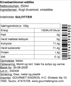 Kirsebærblomst eddike er en balsamicoeddike fra Modena, modnet på kirsebærfade for at tilføre et aromatisk og frugtigt udtryk inspireret af kirsebærblomster. Eddiken har en klar, lys farve og en balanceret syre, der gør den velegnet til præcis finish i det professionelle køkken.