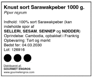 Ingredienser: Sort peber knust - Piper Nigrum. Mulige spor af: SELLERI, SESAM, SENNEP, NØDDER