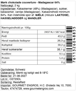 Anvendelse: Brug denne chokolade til at overtrække pralines, lave ganache og skaller. Den kan også anvendes i mousser og cremer
