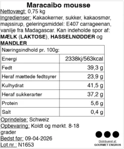 - Mix 750g Maracaibo mousse pulver med 600g kogende mælk. Mælken må IKKE nedkøles. Mælken hældes direkte over pulveret.