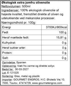 Fremstilling: Sorten som bruges er Picual, og høstes imellem d. 14, – 24. oktober. Olien er koldpresset, hvor massen har en temperatur på 21° uden at der tilsættes vand.