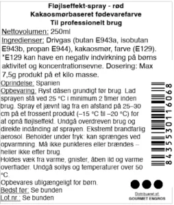 - 3 g produkt (svarende til ca. 2 sekunders sprayning) pr. 1 kg produkt, der skal dekoreres.