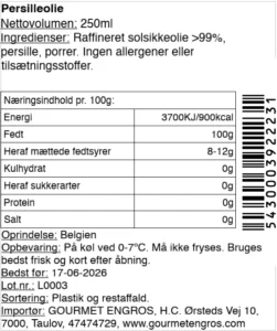 Persilleolien har en ren, grøn og let urteagtig smagsprofil med tydelig friskhed. Smagen er balanceret og anvendelig uden at dominere, hvilket gør olien velegnet som løftende element i både klassiske og moderne retter. Den bevarer persillens naturlige farve og aroma og fremstilles uden tilsætningsstoffer eller konservering.