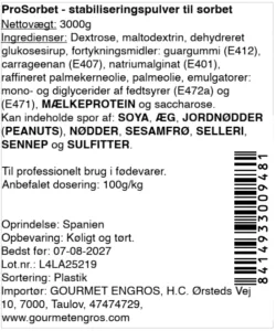 Prosorbet 100 Cold er en professionel blanding af stabilisatorer, emulgatorer, aeratorer og tekniske sukkerarter, udviklet til stabilisering af sorbet og andre kolde desserter. Produktet er designet til kold anvendelse, hvor ingrediensen blandes direkte i væsken uden opvarmning.