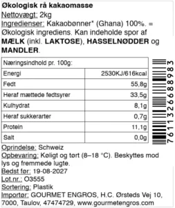 Den økologiske kakaomasse fra Suhum, Ghana er en ren og uforarbejdet kakaobase fremstillet af 100% kakaokerner fra økologisk dyrkning. Produktet udgør grundelementet i fremstillingen af couverture-chokolade og anvendes som smagsgiver i professionelle konditor- og chokoladeproduktioner.