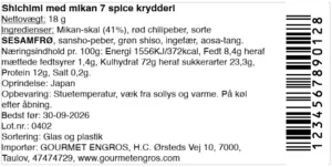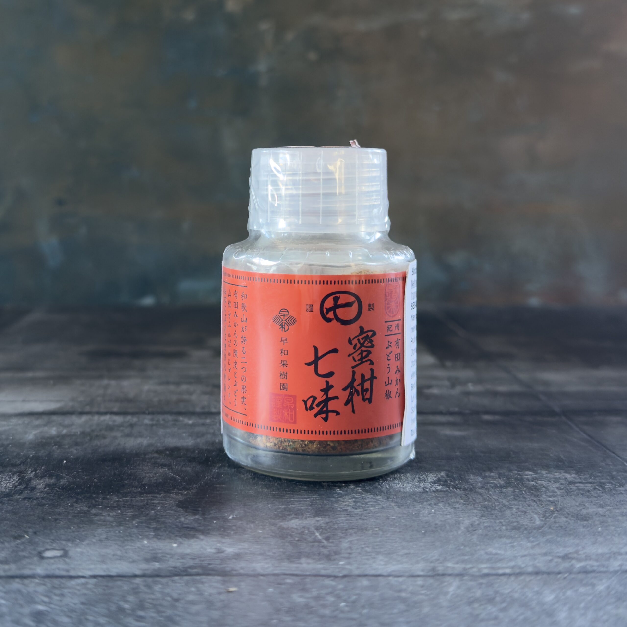 Shichimi togarashi er en klassisk japansk krydderiblanding bestående af syv ingredienser, hvor “shichi” betyder syv og “mi” betyder smag. Denne variant kombinerer to af Wakayama-regionens signaturingredienser: mikan-skal og sansho-peber.