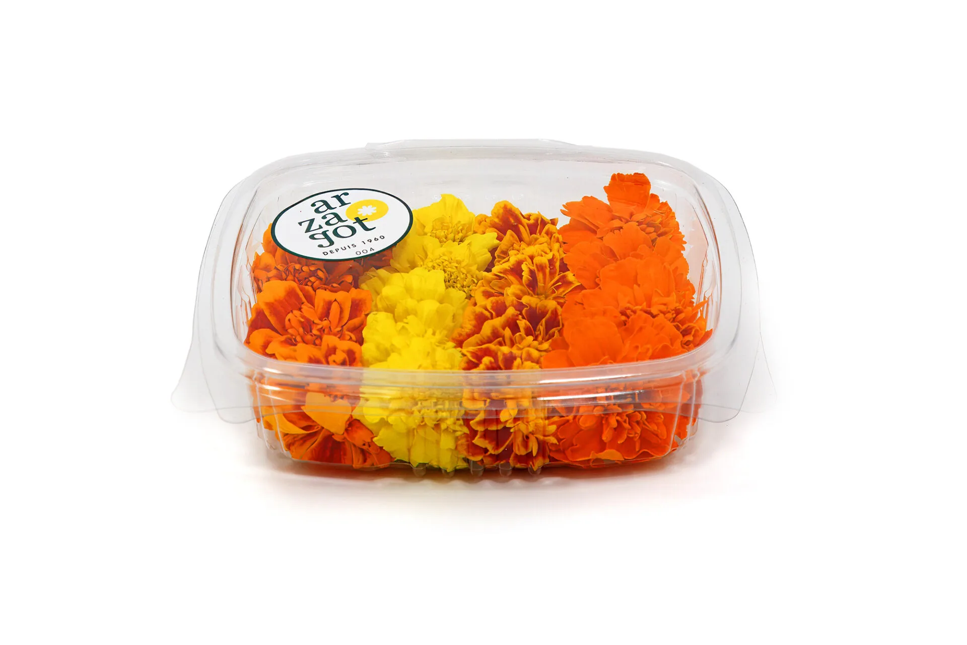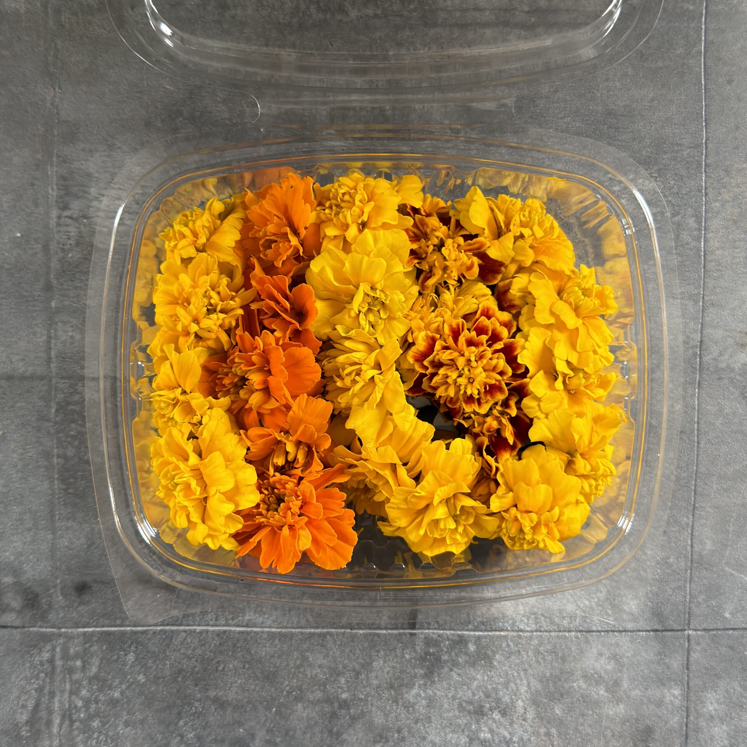 Tagetes mix (Tagetes patula) er spiselige blomster i forskellige nuancer fra intens gul til dyb rød. Blomsterne har en karakteristisk kruset form, hvor kronbladene samles i en kompakt, pompon-lignende struktur.