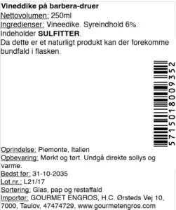 Denne eddike på Barbera-vine har en delikat, transparent granatrød farve og en let, æterisk aroma med tydelige noter af hindbær, salvie og gyvel. Smagen er frisk og klart syrlig, men samtidig behagelig og balanceret – velegnet til præcis brug i det professionelle køkken.