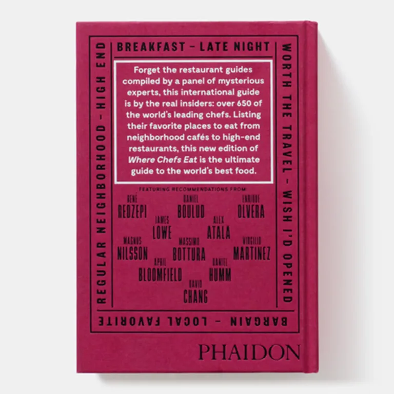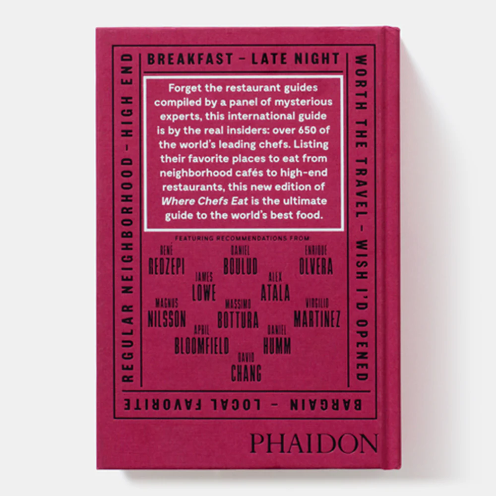 Where Chefs Eat er den ultimative restaurantguide for alle, der ønsker at spise som verdens bedste kokke. Bogen samler 7.000 anbefalinger til 4.500 restauranter i mere end 70 lande, udvalgt af 650 internationale topkokke.