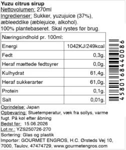 Denne naturlige sirup er fremstillet af yuzu-frugter dyrket i Tokushima-præfekturet. Yuzu har en stærk og kompleks duft, der ligger mellem mandarin og citron. Denne sirup er kombineret med sukker og æbleeddike, som tilføjer sødme og friskhed.